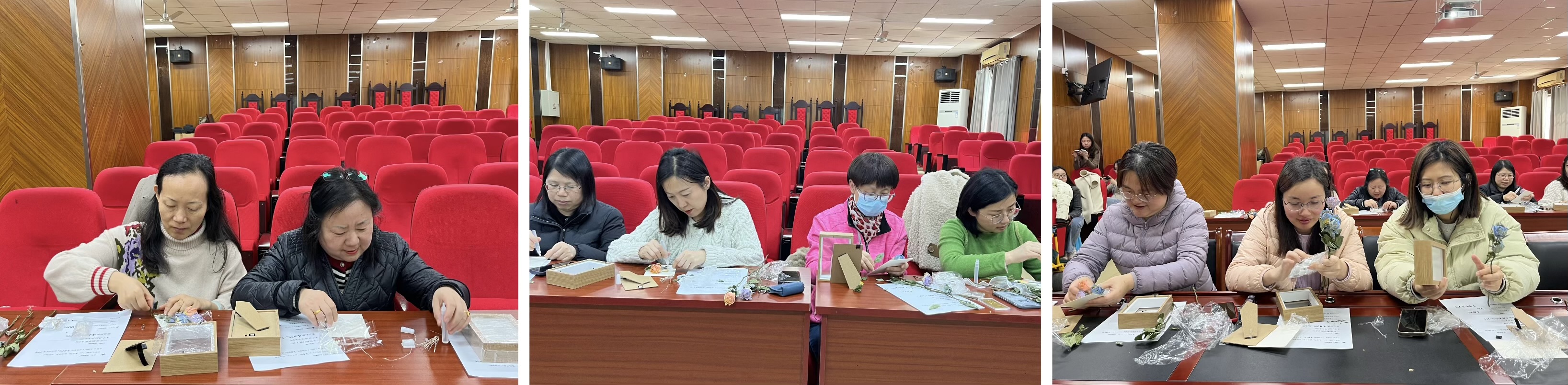 活动现场气氛活跃,老师们想象力和创作灵感迸发,一个相框、几支干花、一串珍珠、一条丝带、一串led灯,在老师们一双双巧手的创意组合下,变成了一件件造型精美的干花相框,每个人都做出了自己专属的节日礼物。