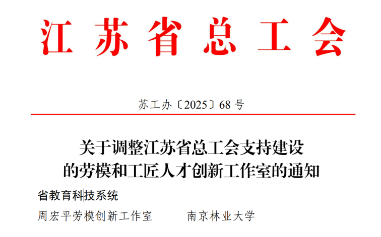 近日,江苏省总工会发布了《关于调整江苏省总工会支持建设的劳模和工匠创新工作室的通知》(苏工办〔2025〕68号),本次江苏省教育科技系统共4个单位获得江苏省总工会支持建设的劳模和工匠人才创新工作室,其中高校2个。我校申报的周宏平劳模创新工作室获得支持建设,这一荣誉既是对周宏平教授领衔的“林业装备及智能化”团队深耕林业机械领域创新实践的高度认可,也是学校产学研协同发展的重要成果。