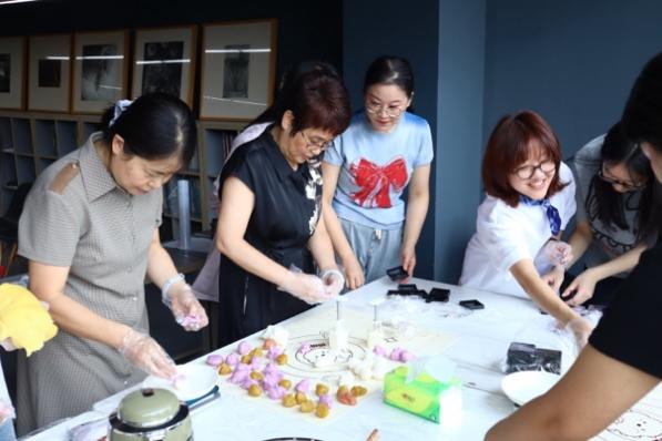 随后是“月满中秋意·饼甜谢师情”手工冰皮月饼制作活动。在洪泓老师的悉心指导下,师生们满怀热情地共同投入到制作环节中:和面、搓皮、包馅、压模,每一步都做得认真细致,一丝不苟。大家分工明确,协作无间,互帮互助,现场氛围温馨而热烈,洋溢着欢声笑语。豆沙、抹茶、五仁等多种口味的馅料,为月饼增添了丰富滋味。制作完成后,学生们满怀敬意地将月饼精心包装入盒,并附上真挚的谢师赠言,亲手送到老师们手中,师生之情在甜蜜与协作中愈发深厚。