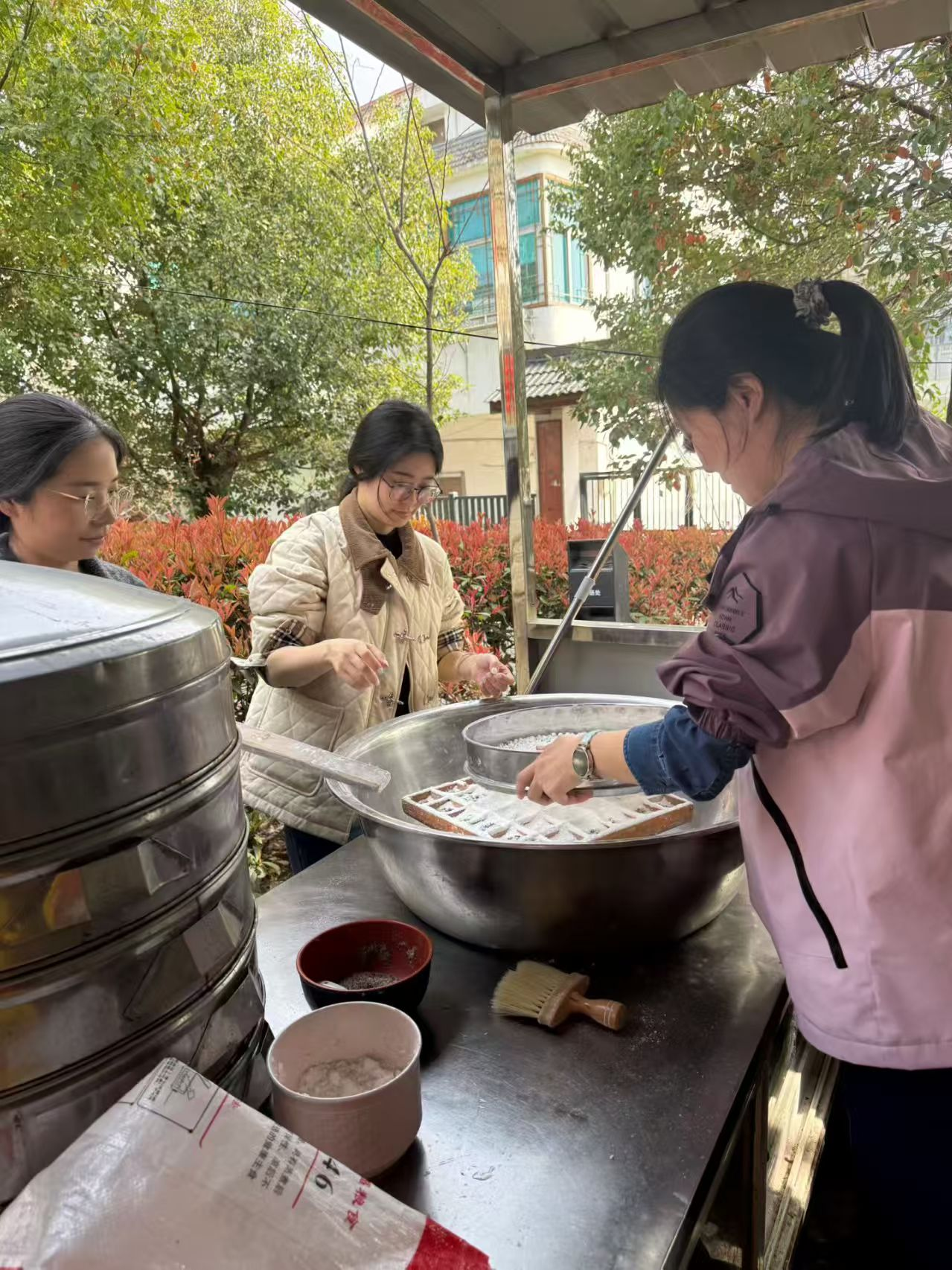 另一边,做米糕组的教职工们则来到了当地农户家中,体验传统米糕的制作工艺。在农户的耐心讲解下,筛粉、装模、蒸制,每一个步骤都饱含着对传统技艺的敬畏。当热气腾腾的米糕出锅,软糯香甜的气息弥漫整个屋子。大家品尝着自己亲手制作的米糕,脸上满是满足的笑容,在动手实践中感受着乡村美食的独特魅力。