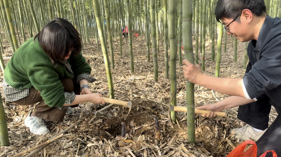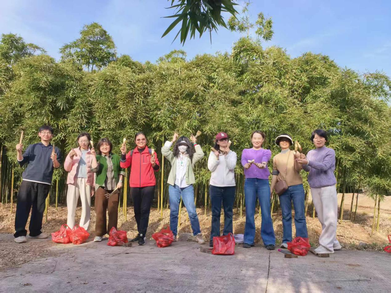 午后,工会为大家安排了充满乡土趣味的体验活动,教职工们自由分为两组,开启了不同的春日探索之旅。挖笋组的教职工们走进郁郁葱葱的竹林,在当地农户的指导下,仔细寻找着藏在泥土中的春笋。大家手持小锄头,小心翼翼地刨开泥土,当一个个鲜嫩饱满的春笋破土而出时,现场欢呼声此起彼伏,每挖出一棵笋都充满了成就感,竹林里回荡着大家的欢声笑语。